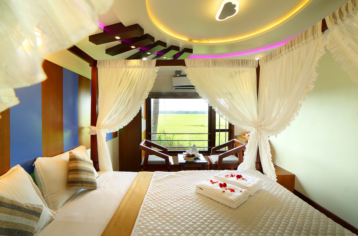 The spacious and well-furnished interiors provide the perfect setting for relaxation As you explore the serene backwaters of Alleppey and Kuttanad, you’ll have the opportunity to witness the magic of these landscapes, from islands and lagoons to backwater villages and winding canals. This intimate experience is reserved exclusively for you and your loved ones, ensuring a private and tranquil retreat.